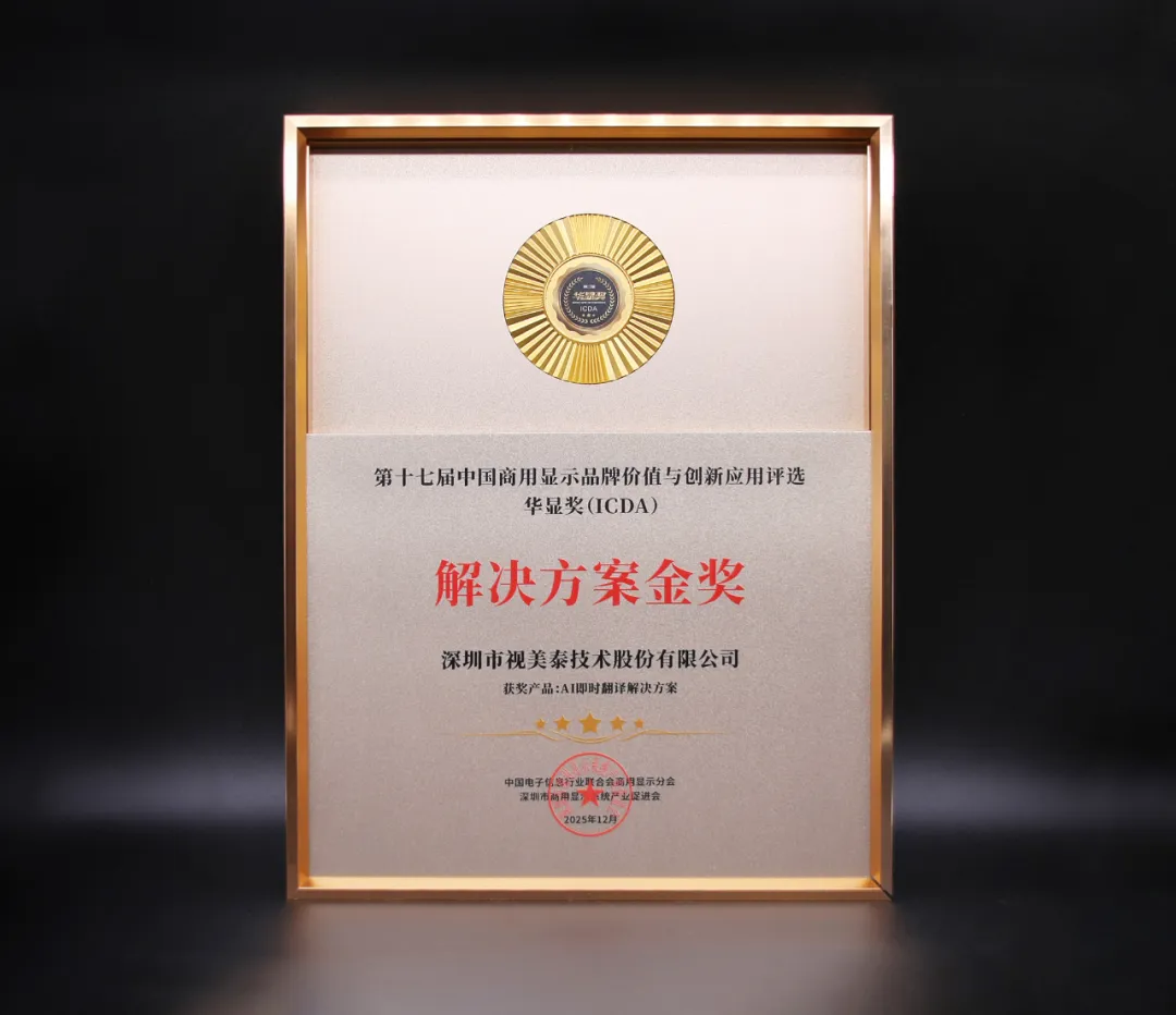 同时,视美泰自主研发的"AI 即时翻译机解决方案"在众多参评项目中脱颖而出,斩获年度"解决方案金奖"。该奖项历经大数据筛选、公众投票与专家评审等多重严格流程,含金量十足。此次获奖,不仅体现了视美泰在"AI + 商用显示"领域的技术领先性,也印证了行业对其在打破语言壁垒、赋能全球沟通方面创新价值的高度认可。