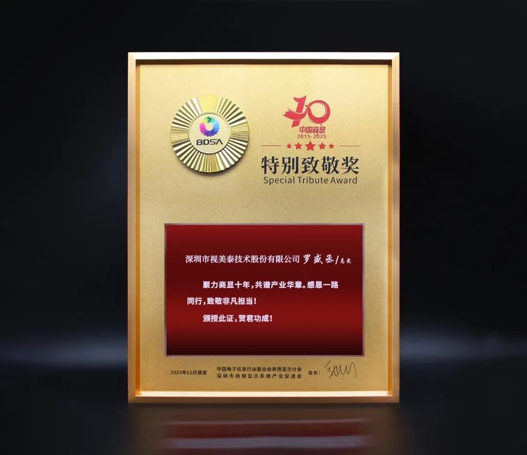深圳市视美泰技术股份有限公司深度参与本次盛会。凭借十余年在商用显示与智能终端领域的持续深耕,公司总裁罗盛丞先生荣获大会颁发的"特别致敬奖",彰显了其在行业发展中的长期贡献与责任担当。