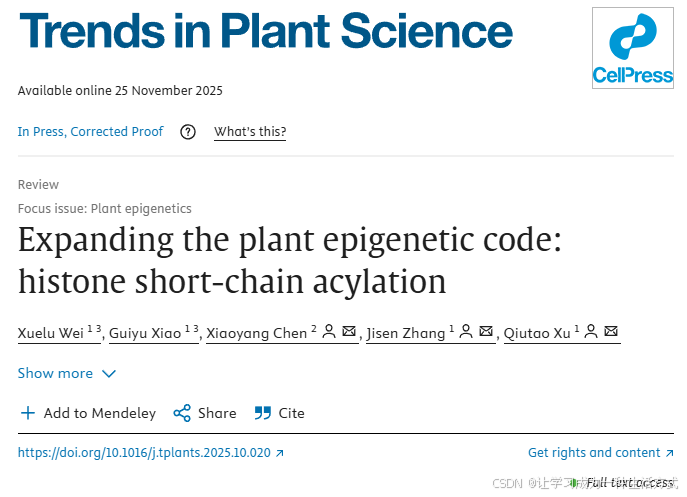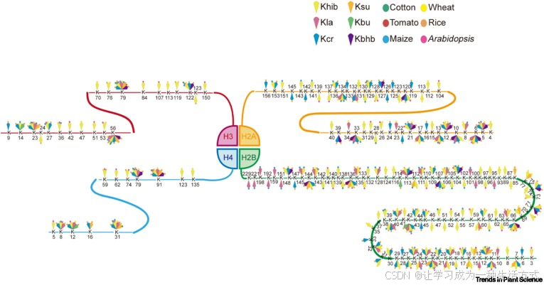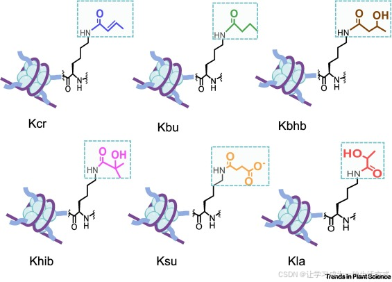 表观遗传修饰(详见术语表)在介导环境信号与植物基因组调控的关联中发挥关键作用。长期以来,组蛋白甲基化、乙酰化等组蛋白修饰,一直被认为是调控染色质结构及转录活性的重要方式(见专栏 1)。近年来,组蛋白赖氨酸残基上发现的多种短链酰化修饰类型 ------ 包括乙酰化(Kac)、巴豆酰化(Kcr)、丁酰化(Kbu)、β- 羟基丁酰化(Kbhb)、2 - 羟基异丁酰化(Khib)、琥珀酰化(Ksu)及乳酰化(Kla),极大地拓展了表观遗传调控的研究范畴 [1., 2., 3., 4., 5., 6., 7.]。这些新型组蛋白酰化修饰的发现,揭示了表观遗传调控的复杂性,也为基因表达与染色质动态调控机制增添了新的研究维度。