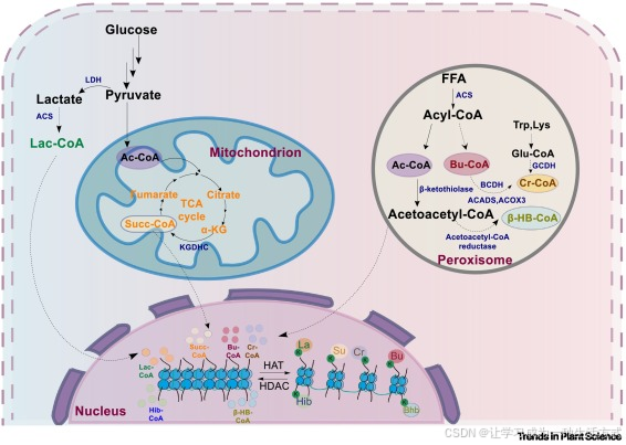 组蛋白酰化修饰并非是乙酰化修饰的简单结构变体,其还与细胞代谢活动密切相关 ------每种酰化修饰均来源于特定的代谢通路。在动物细胞中,这类修饰的酰基供体为不同的辅酶 A(CoA)偶联型酰基分子,而这些分子同时也是代谢网络中的关键中间产物。尽管动物细胞中组蛋白酰化修饰的代谢来源已阐释明确,但植物细胞中多数非乙酰化酰化修饰的具体来源,目前仍处于深入研究阶段。不过已有研究证据显示,与动物类似,植物或许也能利用不同的代谢库,为组蛋白酰化修饰提供酰基辅酶 A。