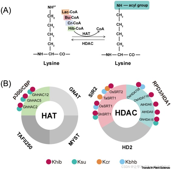 (A)组蛋白乙酰转移酶(HAT)与组蛋白去乙酰化酶(HDAC)对赖氨酸残基酰基的添加与移除作用。(B)赖氨酸酰基转移酶(催化酶)与去酰化酶(去修饰酶)的酶学活性。缩略词说明:At,拟南芥;Bu-CoA,丁酰辅酶 A;CBP,环磷腺苷效应元件结合蛋白结合蛋白;Cr-CoA,巴豆酰辅酶 A;Gh,陆地棉;GNATs,GCN5 相关 N - 乙酰转移酶家族;HAT,组蛋白乙酰转移酶;HDAC,组蛋白去乙酰化酶;Hib-CoA,2 - 羟基异丁酰辅酶 A;Kbhb,赖氨酸 β- 羟基丁酰化;Kcr,巴豆酰化;Khib,2 - 羟基异丁酰化;Ksu,琥珀酰化;Lac-CoA,乳酰辅酶 A;MYST,Moz、Ybf2、Sas2 及 Tip60 蛋白家族;Os,水稻;RPD3,钾离子依赖降低蛋白 3;SIR2,沉默信息调节因子 2;Ta,小麦;TAFII250,TATA 结合蛋白相关因子 Ⅱ250。
