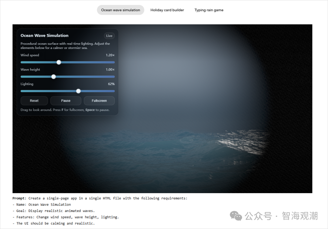 - 可视化与交互工具支持 支持生成SVG、3D模型、网页模拟器(如波浪模拟器、卫星信号系统),提供代码实时运行与调试功能,降低多模态应用开发门槛,尤其适配前端与设计类开发者需求。