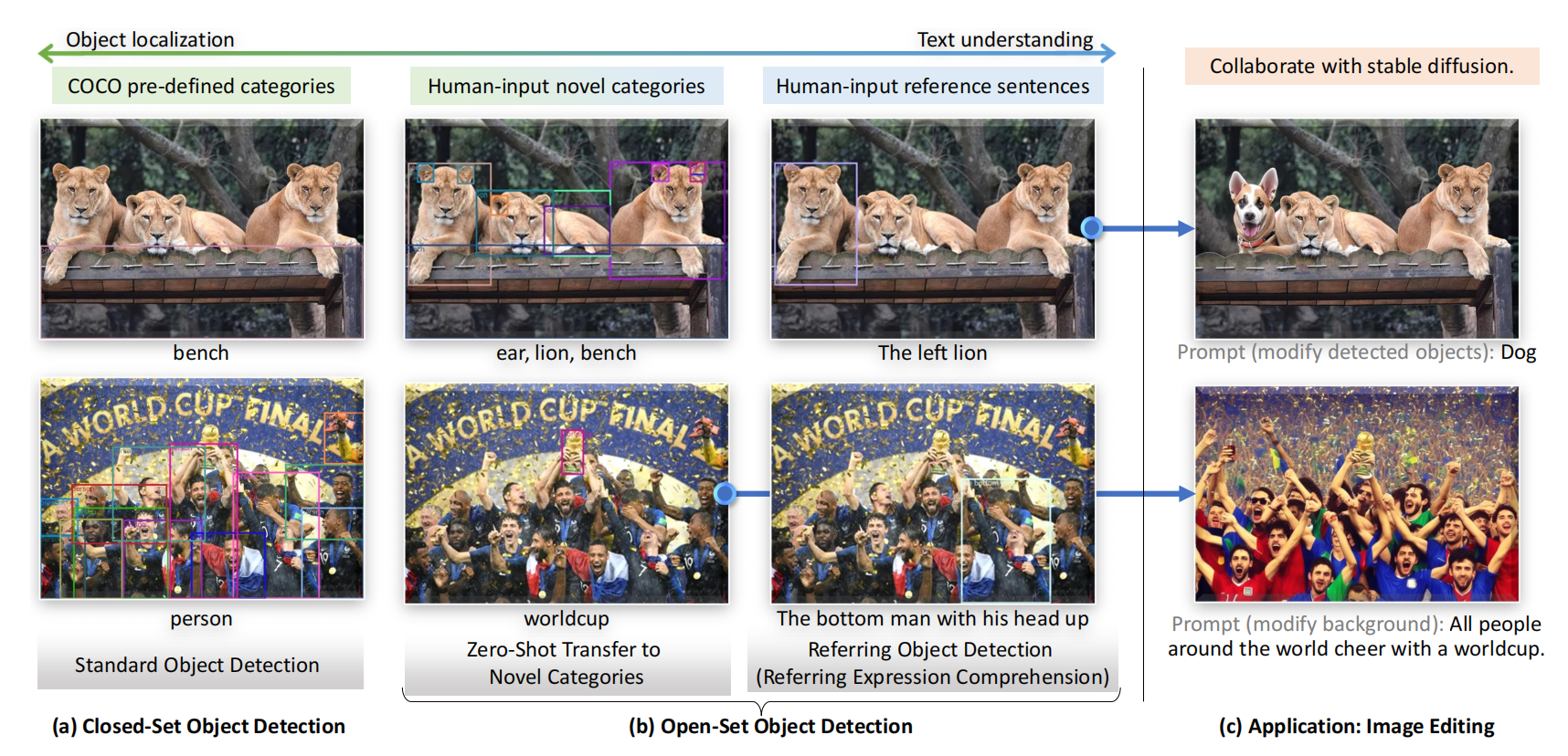 GroundingDINO 是一个文本-图像匹配 的目标检测模型,能够根据自然语言描述定位图像中的任意目标,无需预定义类别。其中双编码器负责特征提取,图像骨干(Swin-T/Swin-L)、文本骨干(BERT-base),提取多尺度视觉 / 语义特征。特征增强器负责跨模态融合,堆叠自注意力、文本 - 图像交叉注意力、图像 - 文本交叉注意力,对齐双模态特征。GroundingDINO的核心创新是① 三阶段紧密融合方案 (特征增强器 + 语言引导查询选择 + 跨模态解码器),实现语言与视觉模态的深度交互;② 子句级文本特征,避免无关类别间的注意力干扰。传统开放集检测痛点:仅在部分阶段融合模态(如 GLIP 仅颈部融合、OV-DETR 仅查询初始化融合),泛化能力有限;文本表示存在细粒度信息丢失或类别干扰,Grounding DINO 通过全流程融合和优化文本表示,提升了开放集泛化的准确性与稳定性。