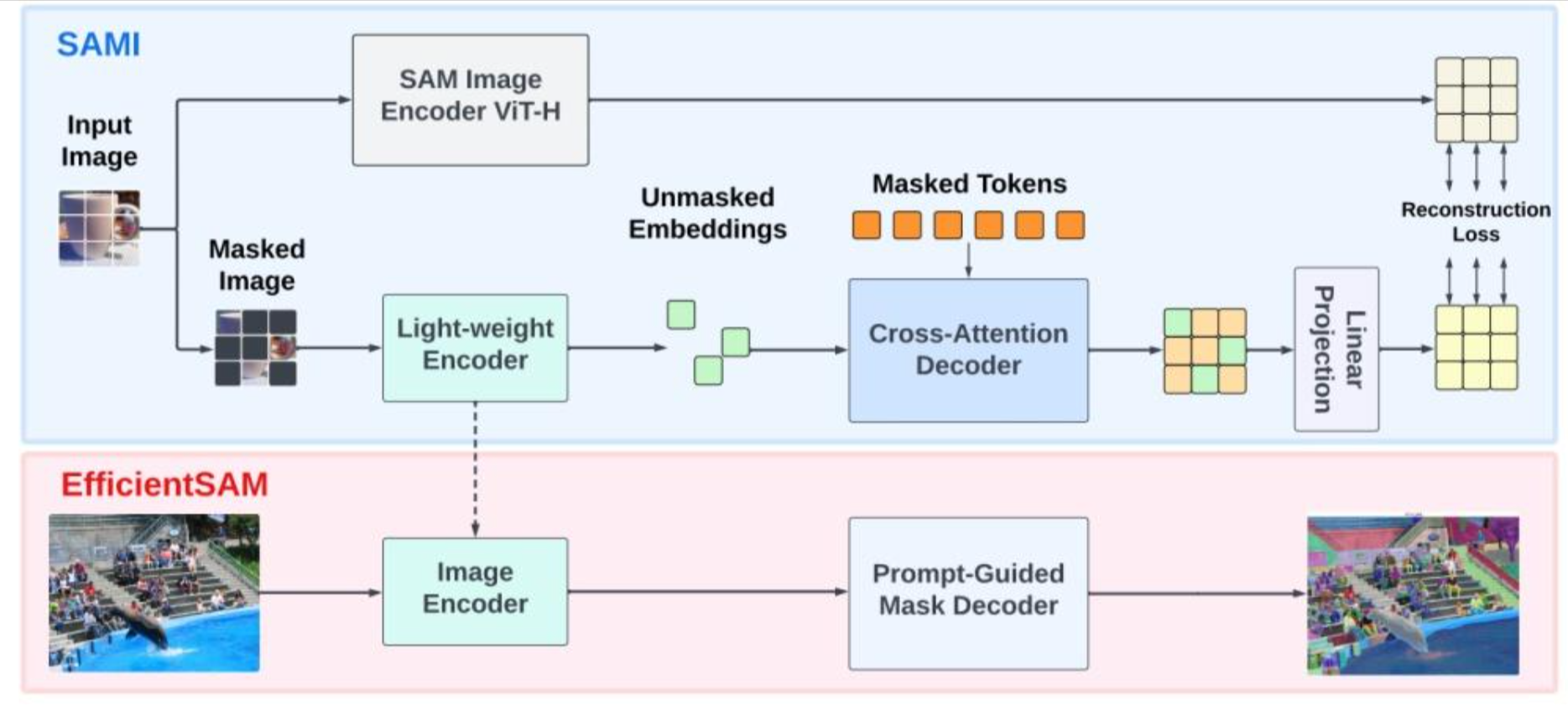 EfficientSAM 用原始 SAM 的大模型(ViT-H 骨干)生成高质量图像特征嵌入,作为 "监督信号";再训练轻量级 ViT 编码器(如 ViT-Tiny/ViT-Small),从这些 SAM 特征中 "重建" 信息,而非直接从原始图像补丁重建。