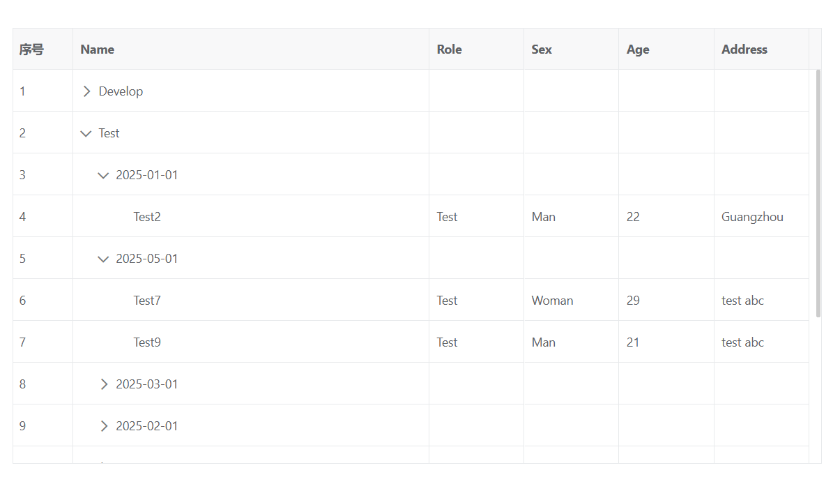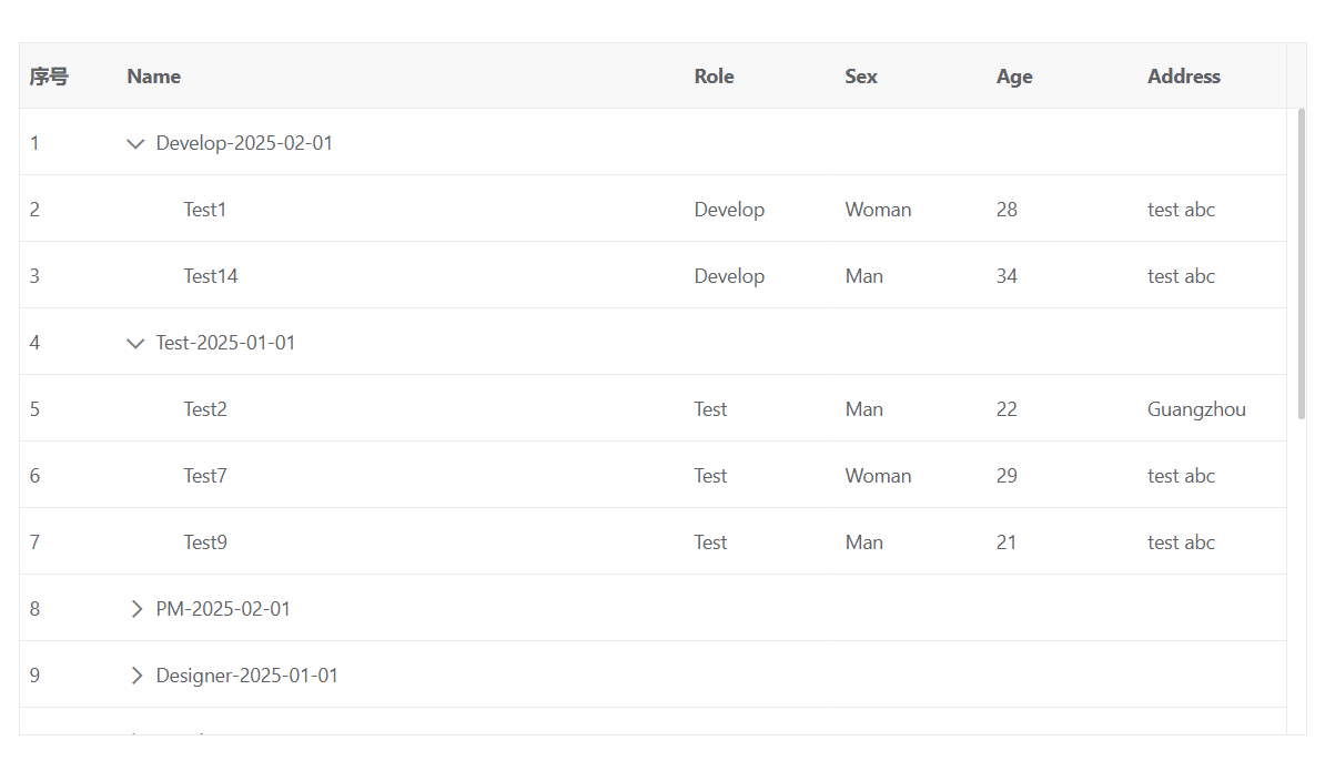 { id: 10006, name: 'Test6', role: 'Designer', sex: 'Man', age: 30, date: '2025-03-01', address: 'test abc' },