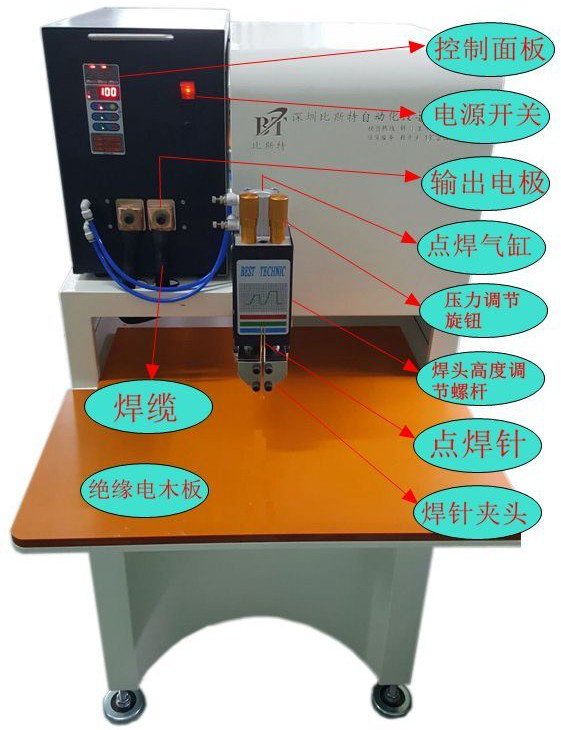 气动点焊机采用电阻焊原理,通过气动系统驱动电极以微米级精度定位电池极柱,结合微处理器控制的电流脉冲参数,在毫秒级时间内完成金属熔融连接。其核心优势在于: