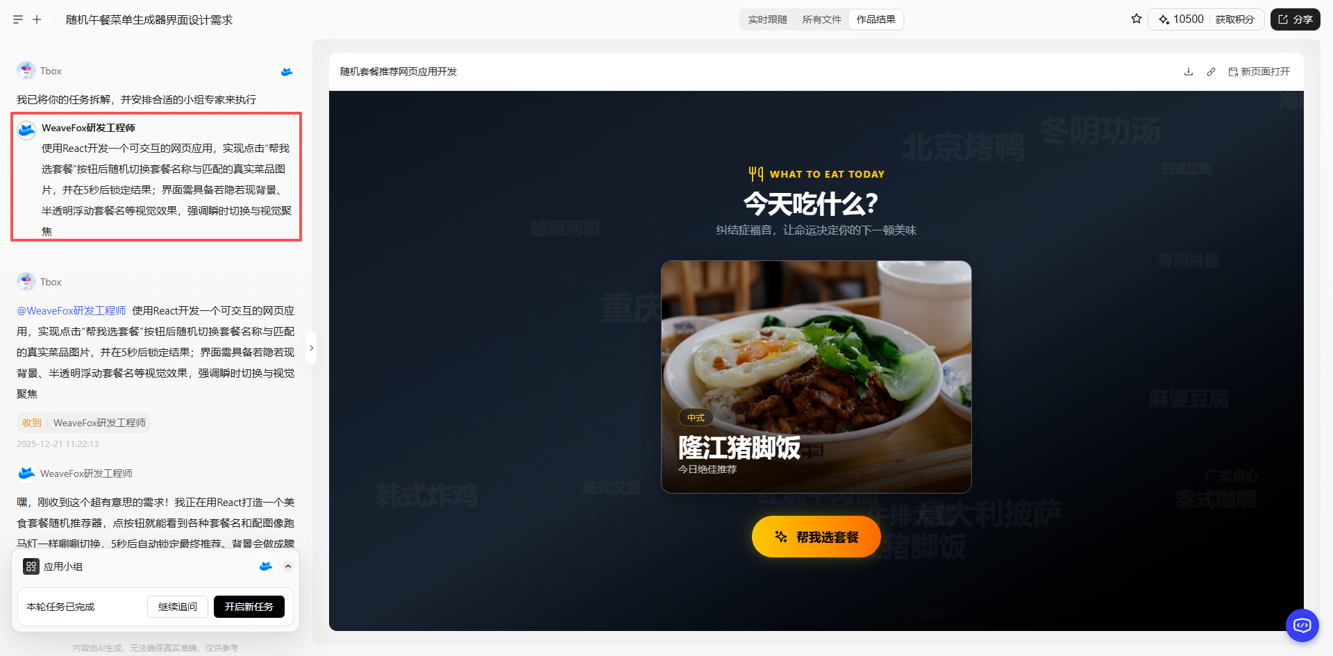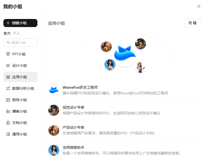 | 应用小组 | 包含产品设计专家(撰写PRD)和视觉设计专家(生成网页视觉建议) |
