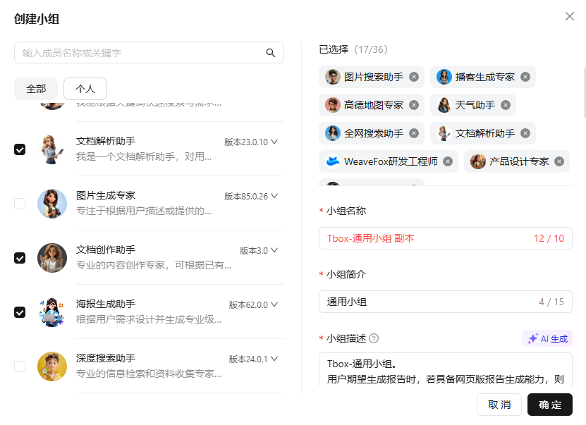 | 文档小组 | 文档解析、深度搜索、内容创作,支持信息梳理与高质量文档生成 |
