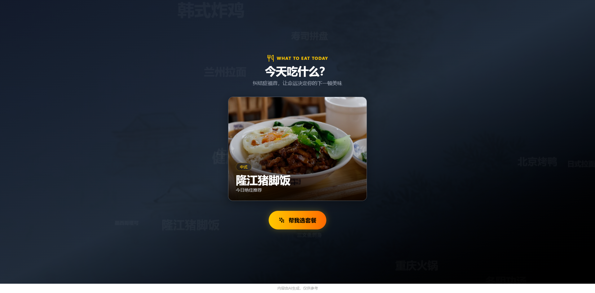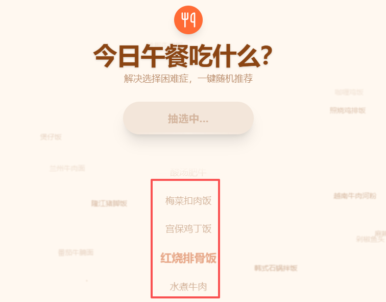 每天中午都不知道吃什么,帮我做一个随机生成一个菜单,比如:鱼香肉丝、隆江猪脚饭等等。