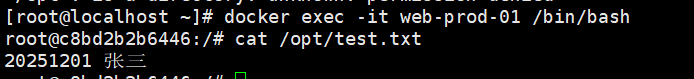 * 容器内验证:`cat /opt/test.txt`(用 exec 进入或直接 exec 执行)