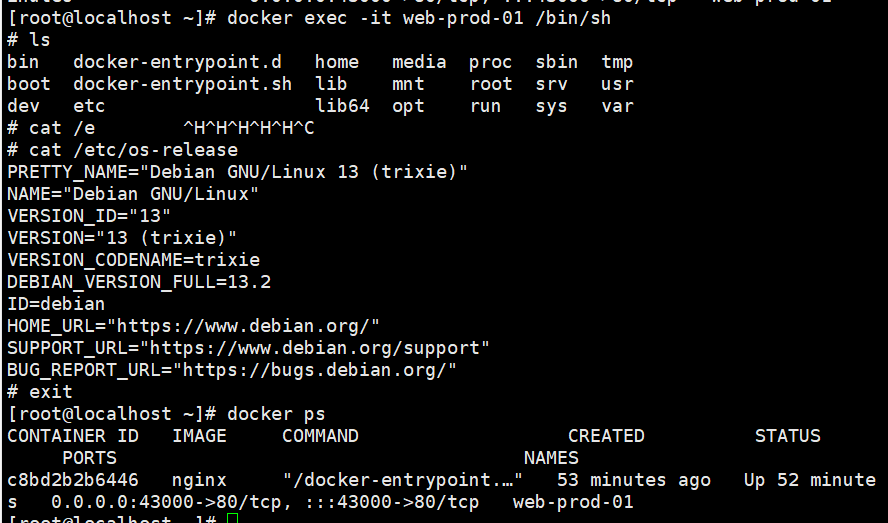 * `docker exec -it web-prod-01 /bin/sh` 或 `/bin/bash` 过程截图(含命令与输出)
