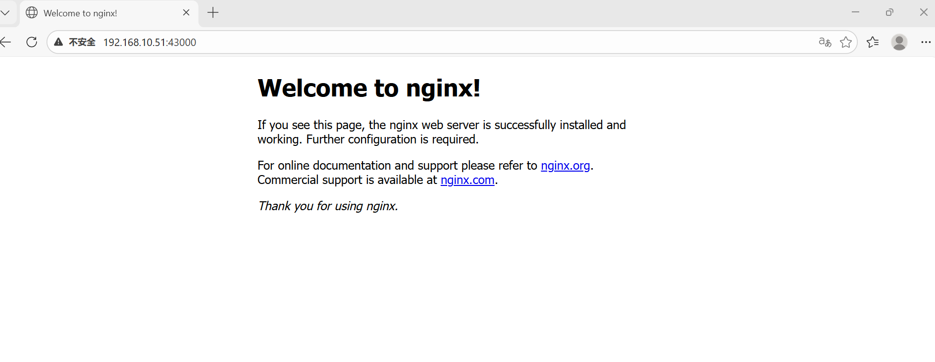 * 浏览器访问 `http://宿主机IP:43000` 的截图(或 curl 输出)