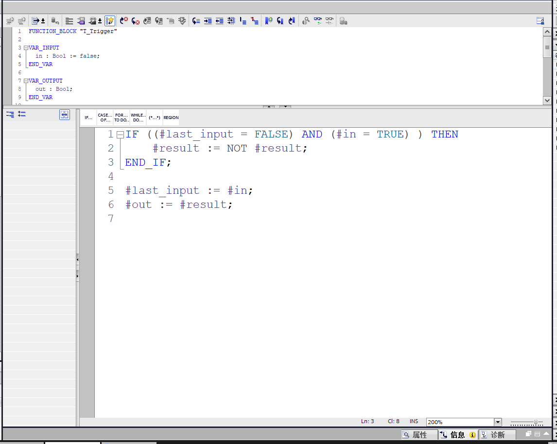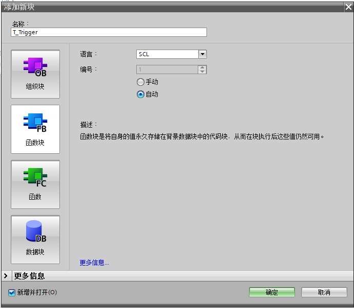 点击 "添加新块" 创建一个 FB 块,语言选择 SCL,块名称为 T_Trigger .