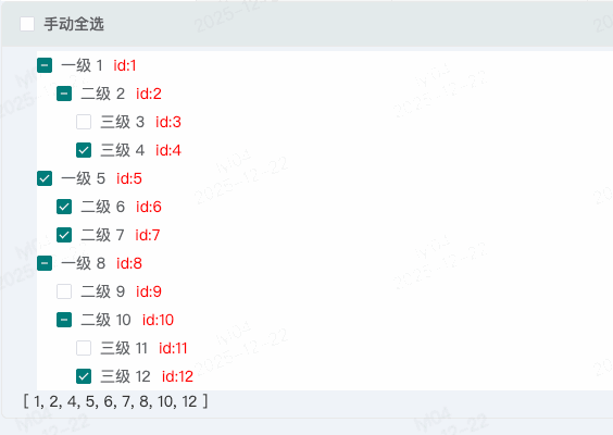 submitData.value = treeRef.value?.getCheckedNodes(false, true)?.map(node => node.id) //得到 所有选中的节点id [ 1, 2, 4, 5, 6, 7, 8, 10, 12 ]