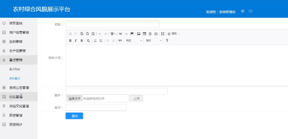 对于后台的管理来说,最重要的使用群体就是管理者,那么管理者更需要看到的是一些统计类型的数据,能够将这些统计类型的数据一眼的反馈给管理者,对于他们的决策和判断会起到非常好的辅助作用。后台对于景点的管理也提供单独入口。如下图所示: