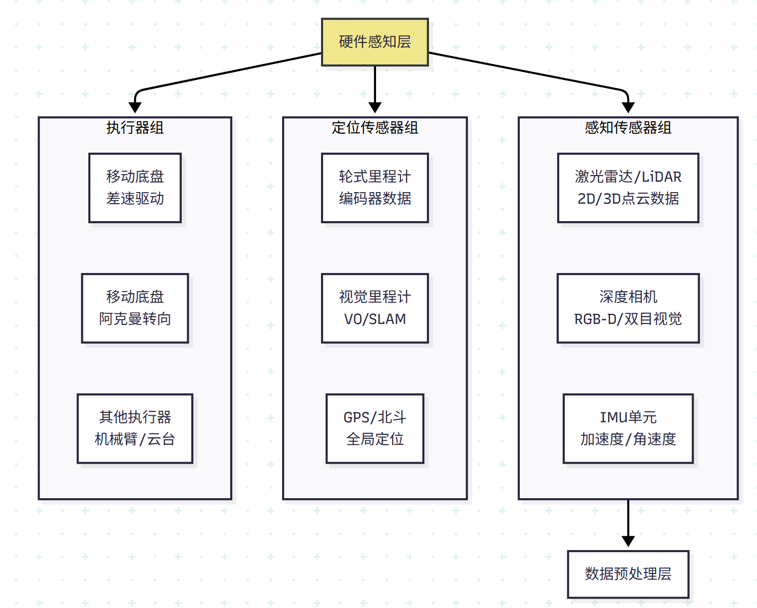 硬件感知层的所有数据均通过 ROS 2 Topic 原生输出,无需依赖 Nav2 框架逻辑,仅需保证数据频率(如激光雷达≥10Hz、里程计≥20Hz)和格式标准化,即可被上层预处理模块接收。