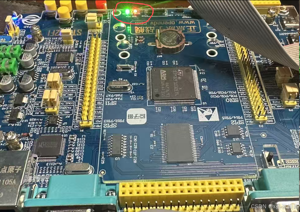 最后在mdk中编译下载,就可以看到两颗LED被点亮了,当然前提是你已经连接好J-LINK到开发板