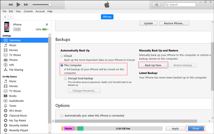 - 点击"立即备份"按钮。请注意,iTunes 不支持选择性备份短信或特定数据。