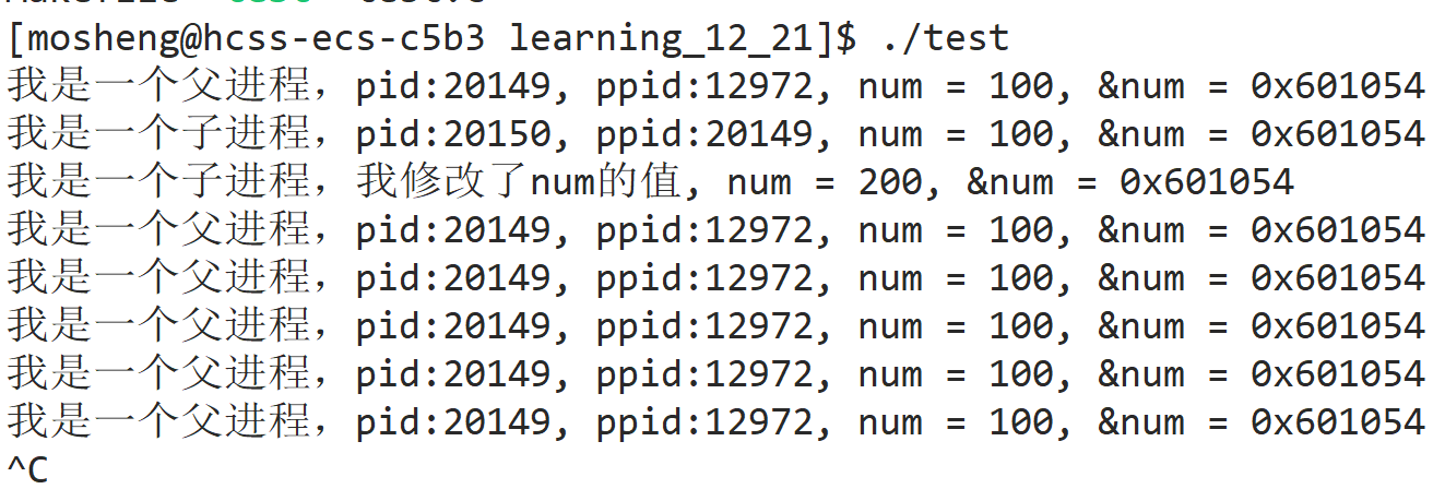 - 我设置了一个全局变量num,这个变量子进程和父进程都能够获取到(父子进程代码共享),在子进程修改num这个值之前,父子进程对应num的值都是100,对应num地址都是0x601054。但是在子进程修改了num这个值之后,子进程里显示num值为200,父进程里显示num值为100,子进程没能影响父进程num的值,但它们的地址还是一样的。
