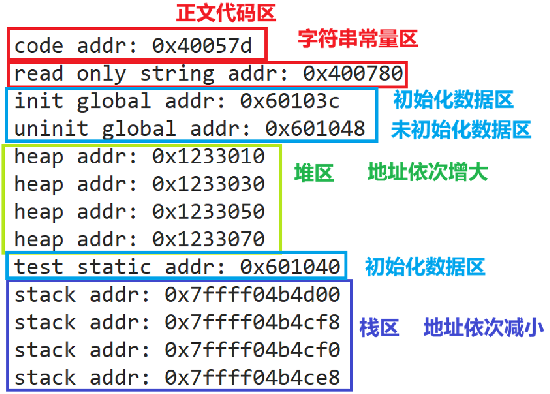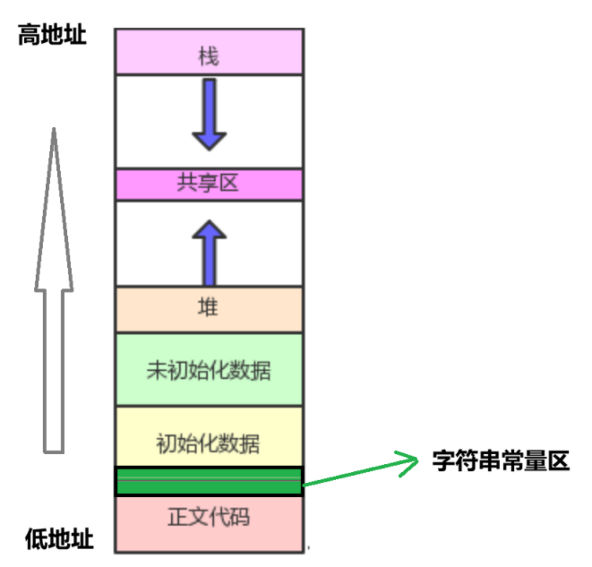 - 经过c语言的学习,相信大家对这张图肯定并不陌生。自下而上,地址递增,分别是正文代码区、字符串常量区、初始化数据区、未初始化数据区、堆区、共享区和栈区。但其实这个图也并不完整,只有在接触了系统之后才能明白完整的图。