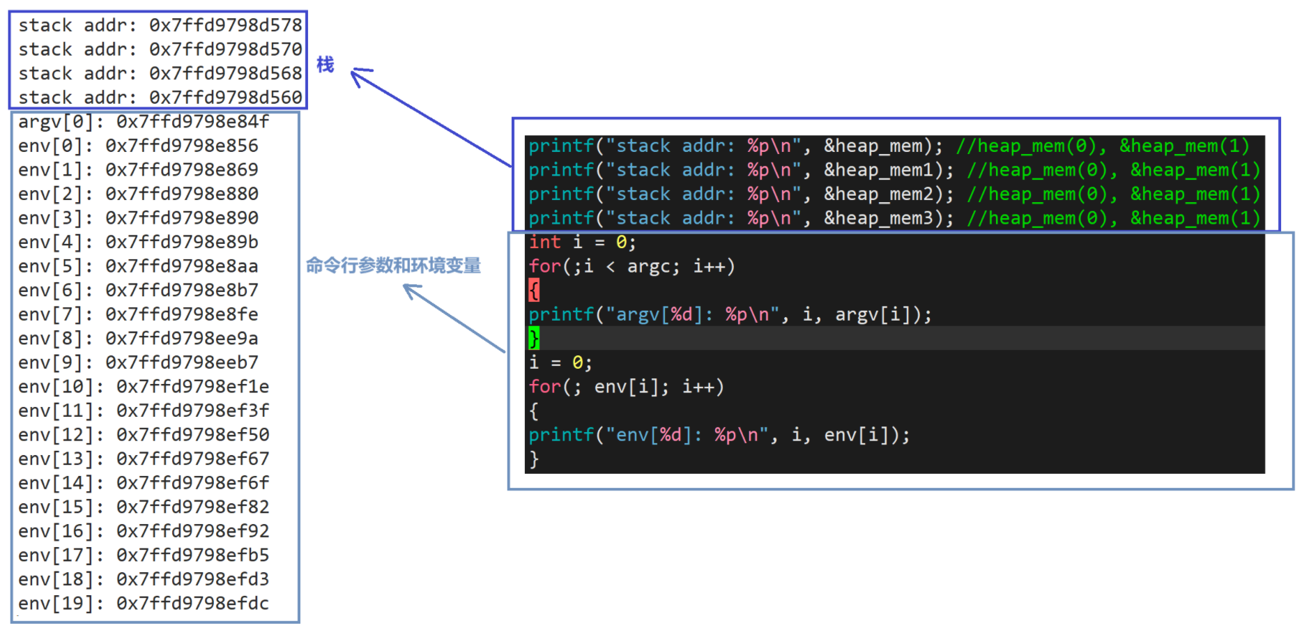 - main是函数名,存放在正文代码区。g_unval 是未初始化的全局变量,存放在未初始化数据区,g_val是已经初始化的全局变量,存放在初始化数据区。str是指针变量,str就是字符串"helloworld"的地址,而&str是指针变量的地址,前者存储在字符串常量区,后者在栈区。test是已经初始化的静态变量,存储在初始化数据区。heap_mem,heap_men1,heap_men2和heap_mem3是指针变量,本身也是地址,它指向堆申请的空间,&heap_mem在栈区,heap_mem在堆区。