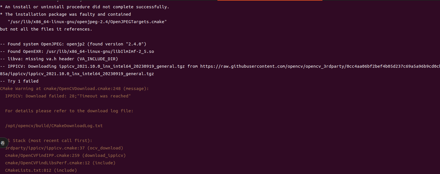 重要提示 :上面命令中的 b7cc5b1062... 和 3a4e4b5b5c... 是占位符,你需要从 /opt/opencv/build/CMakeDownloadLog.txt 日志文件中找到正确的MD5码。使用 cat 命令查看该文件,在 ippicv 和 ade 相关的下载失败条目附近,你会看到类似 expected_md5=xxxxxx 的信息,那就是正确的值。替换上述命令中的占位符即可。