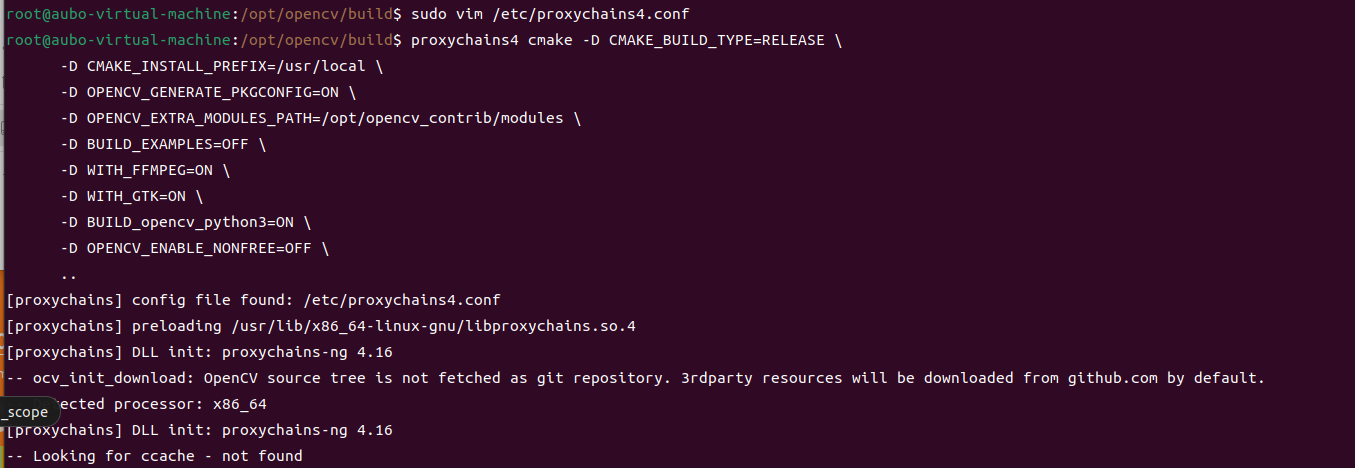 bash# 先确保权限,然后使用proxychains前缀 proxychains4 cmake -D CMAKE_BUILD_TYPE=RELEASE \ -D CMAKE_INSTALL_PREFIX=/usr/local \ -D OPENCV_GENERATE_PKGCONFIG=ON \ -D OPENCV_EXTRA_MODULES_PATH=/opt/opencv_contrib/modules \ -D BUILD_EXAMPLES=OFF \ -D WITH_FFMPEG=ON \ -D WITH_GTK=ON \ -D BUILD_opencv_python3=ON \ -D OPENCV_ENABLE_NONFREE=OFF \ ..proxychains会输出[proxychains] config file found: ...和[proxychains] preloading ...等提示,表示正在通过代理运行。