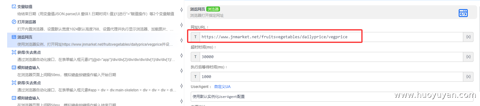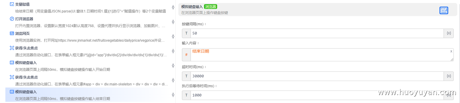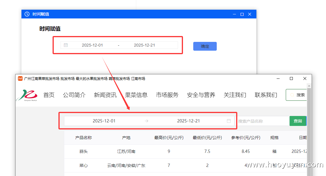 本案例基于火语言RPA实现 "界面『日期时间』控件,自动填充网页日期输入框" 的自动化流程,适用于在网页中填写固定时间范围的场景(比如农产品价格查询、数据统计类网页)。(如 https://www.jnmarket.net/fruitsvegetables/dailyprice/vegprice )