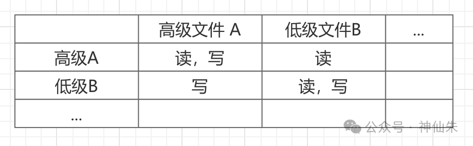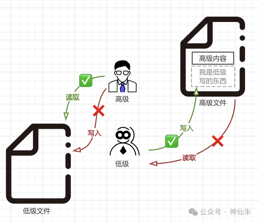 举一个通俗的例子就豁然开朗了:一个小兵可以向将军上报情报(写), 但是不能向将军打探情报(读取)。所以 " 级别高的不能向级别低的 写数据" ,就可以理解成 "将军不能把情报写给 小兵"。 但是同时我又疑惑了,"那小兵自己上报的情况,他自己能读取吗"