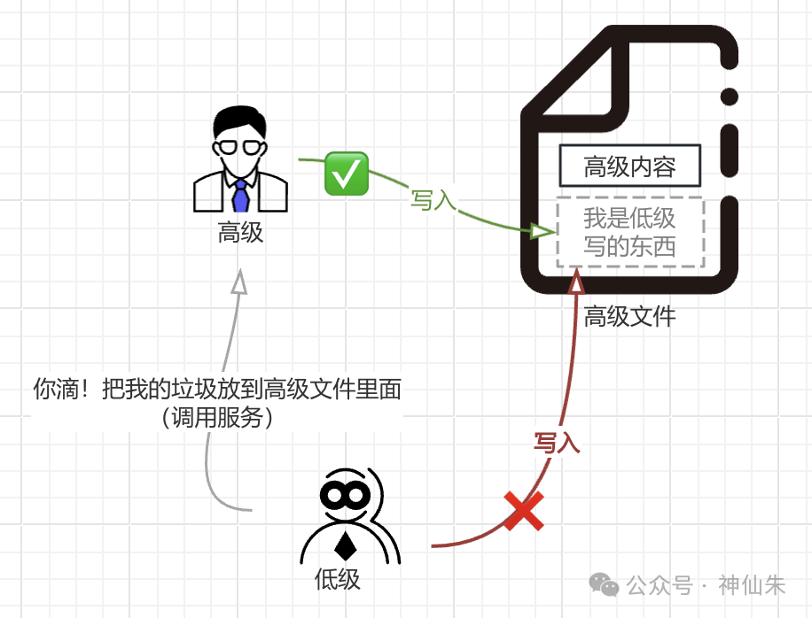 虽然你完整性级别低, 不能写入完整性级别高的文件中,但是有没有可能你让完整性级别高的人 帮你写?