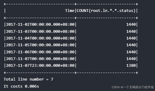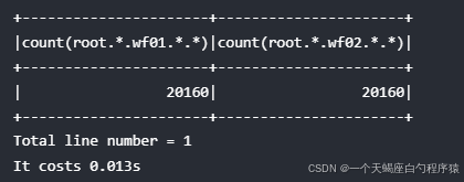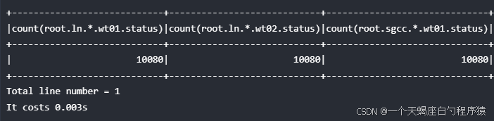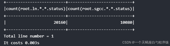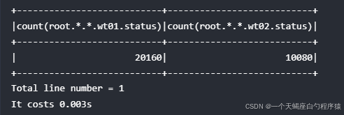 练习1: 不同 database 下均存在名为 status 的序列, 如 "root.ln.wf01.wt01.status", "root.ln.wf02.wt02.status", 以及 "root.sgcc.wf03.wt01.status", 如果需要统计不同 database 下 status 序列的数据点个数,使用以下查询: