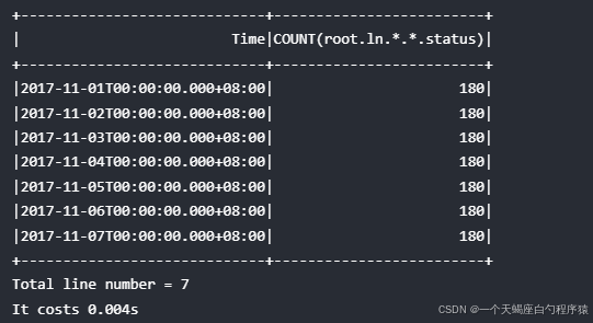 select count(status) from root.ln.wf01.wt01 group by ((2017-11-01T00:00:00, 2017-11-07T23:00:00],1d), level=1;