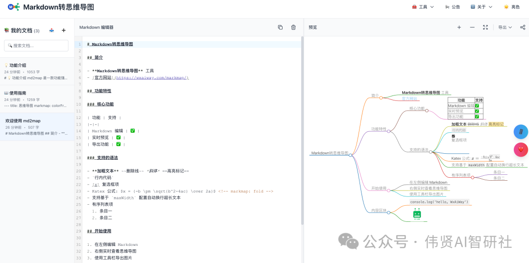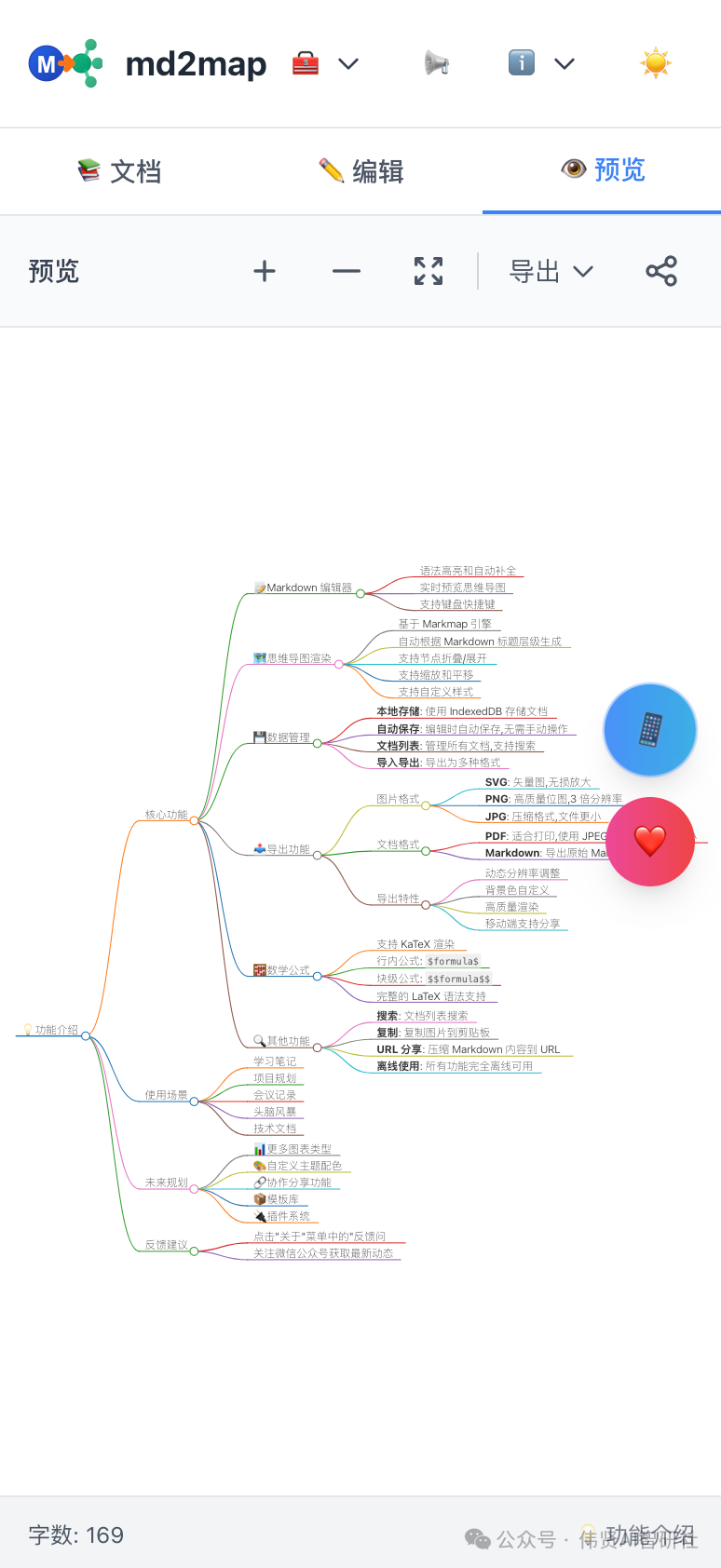 Markmap是一个Markdown转思维导图工具,国外官方网站访问起来有点慢。我结合自己使用习惯,基于Markmap库增加导出png、jpg、pdf格式,同时增加一键分享功能,方便分享Markdown进行再次编辑。
