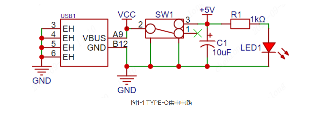 电源电路主要有TYPE-C接口、滑动开关、滤波电容、电源指示灯组成,采用2Pin的TYPE-C接口,简单方便,易于焊接,通过SW1滑动开关控制整个系统电源的导通和关断,C1作为电源滤波电容,R1、LED1组成电源指示灯电路,当系统上电后,电源指示灯点亮进行提示。