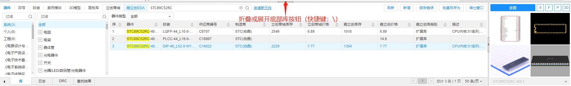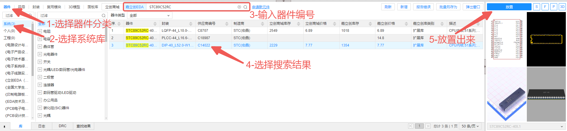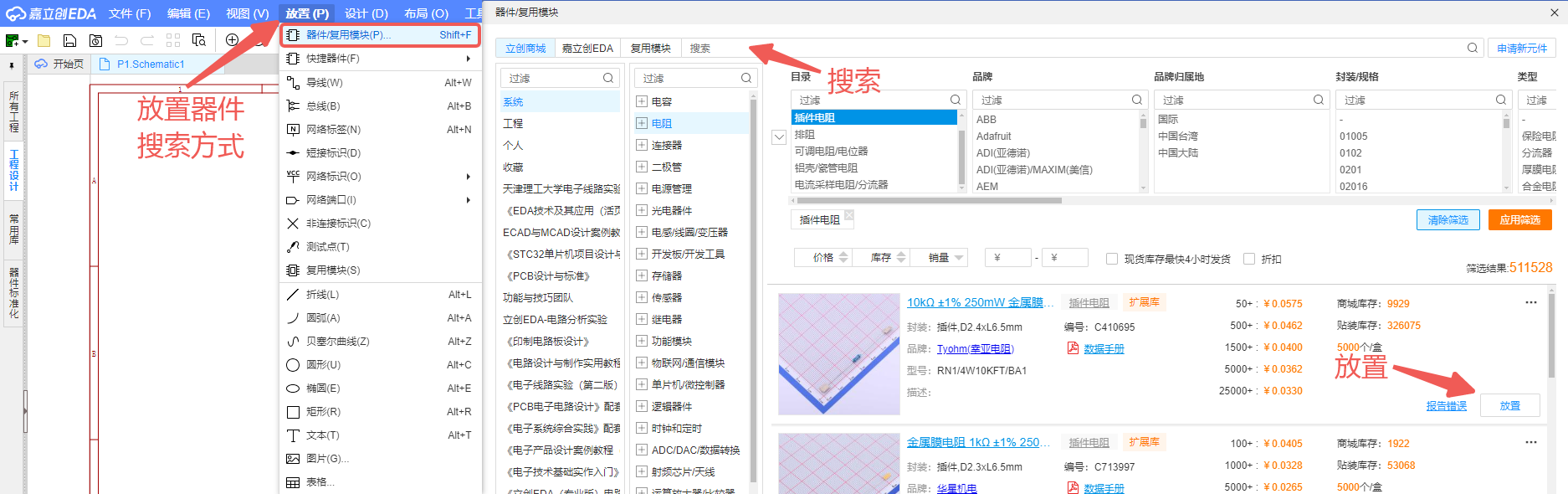 元器件搜索的方式有三种途径,第一种可以在左侧的常用库中找到官方提供的参考库进行放置,优点是比较方便,缺点是库种类较少;第二种方式是通过顶部菜单栏中的放置按钮选项,可以看到器件实物图与参考价格、数据手册等信息;第三种方式是在软件底部面板中搜索放置器件,这种方式的好处是可以看到所选器件的符号、封装与3D模型效果图。
