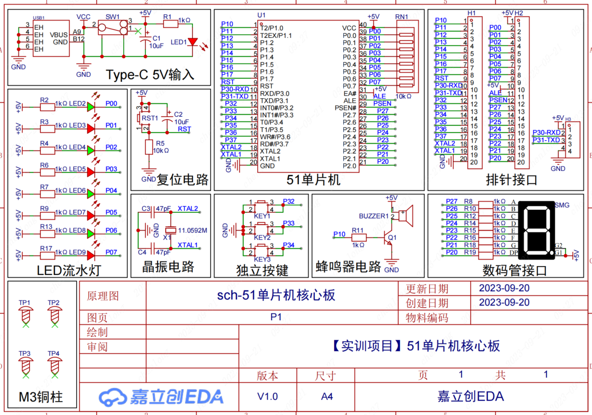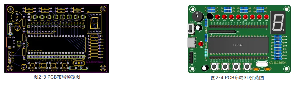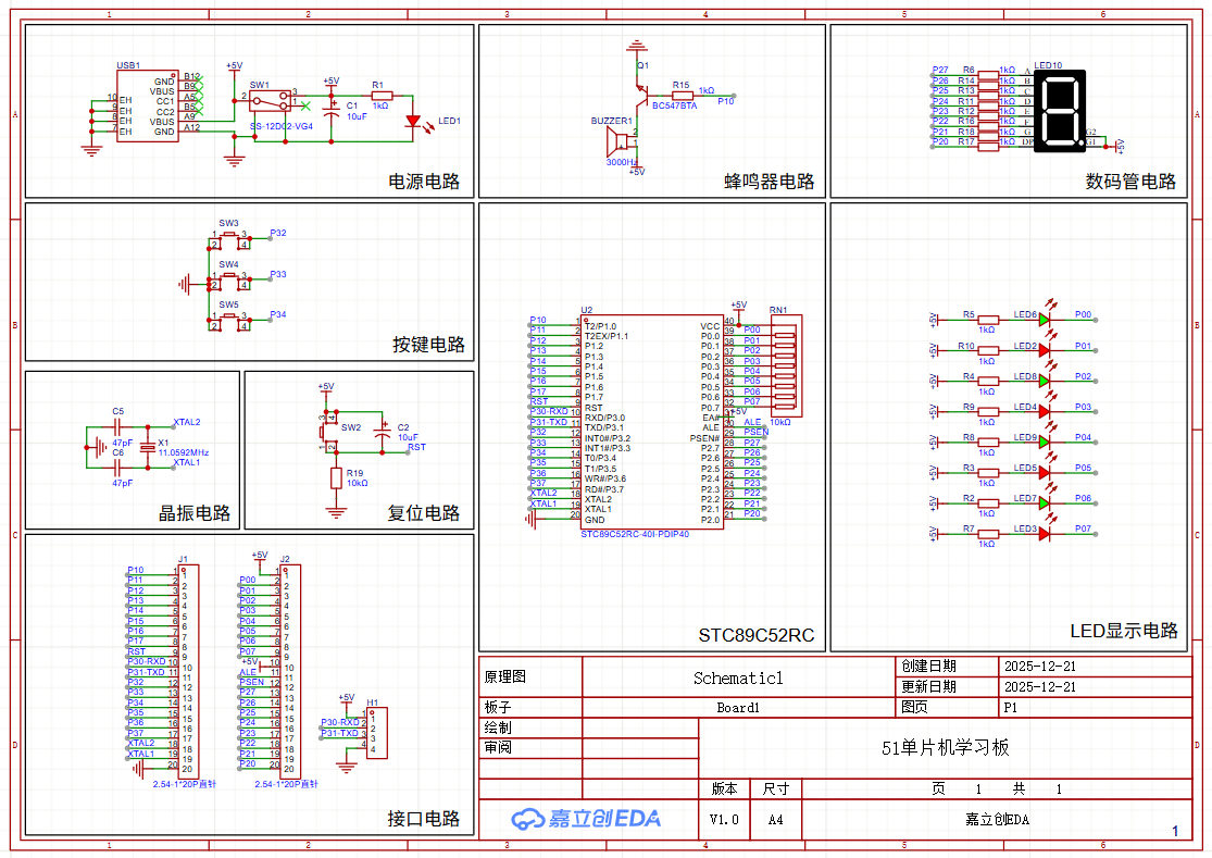 在了解完51单片机学习板硬件电路原理后接下来进行原理图与PCB电路板设计环节,原理图设计部分包含了元器件选型、元器件搜索以及原理图整理的内容;PCB设计部分包含边框设计、元器件分类布局、PCB走线与设计检查、PCB生产与打样等内容。