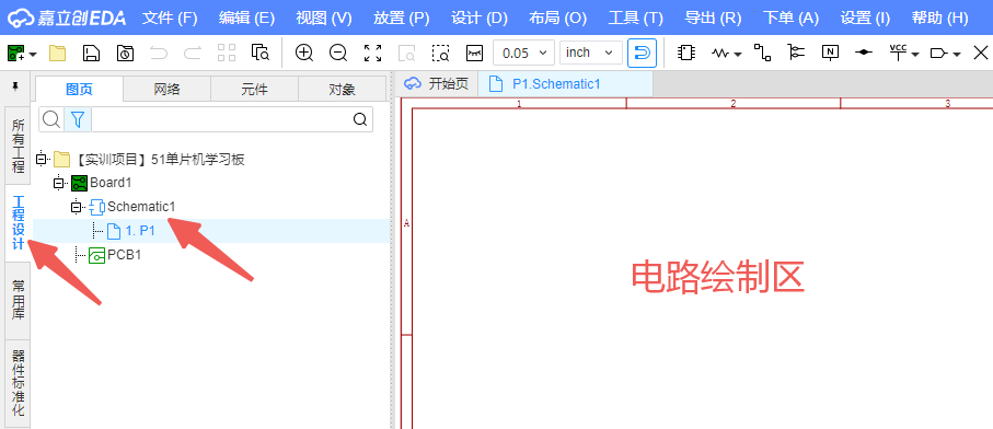 创建好工程后打开左侧工程列表中的Schematic1图页,在右侧画布区域放置元器件进行连接,底下的PCB1是用来绘制PCB图的页面,设计流程是先完成原理图的设计后再到PCB设计。