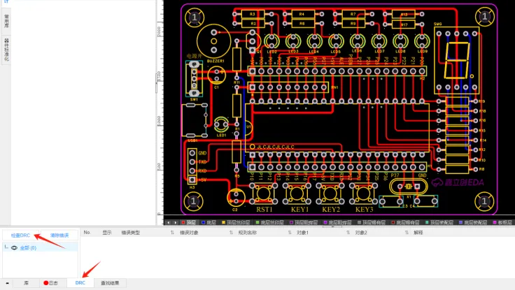 完成走线后点击底部面板中的检查DRC按钮,若显示无报错警告,则代表该PCB设计完成。实际设计过程中往往可能出现各种错误,也可以通过检查DRC找到错误点进行修改,确保PCB板设计一板成功!