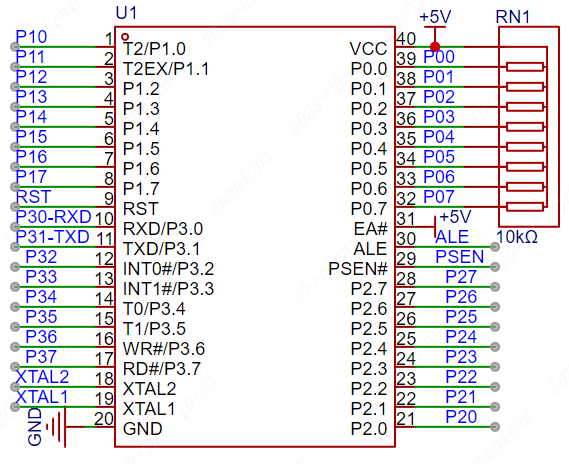 将STC89C52RC芯片四组常用引脚全部引出,方便扩展项目开发,P0口既可以做I/O口,也可以作为地址/数据复用总线使用。P0口是开漏输出,作为总线扩展用时,不用加上拉电阻。作为I/O口用时,必须外接4.7K~10K的上拉电阻。这里P0口使用一个10K的上拉排阻--RN1。