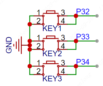 独立按键电路,按键的一侧键入单片机IO引脚,另外一侧接入GND,注意,此时单片机IO引脚不少输出信号,而是接收信号,当外部按键的另一端接入GND时,可以启用内部IO引脚上拉模式,默认引脚为高电平,如果按键按下,引脚会与GND连接,此时为低电平,以此,可以通过检查对应IO引脚是否为低电平来检查按键是否按下。如果外部按键一侧接入高电平,反过来分析即可,需注意增加限流电阻防止IO引脚损坏。
