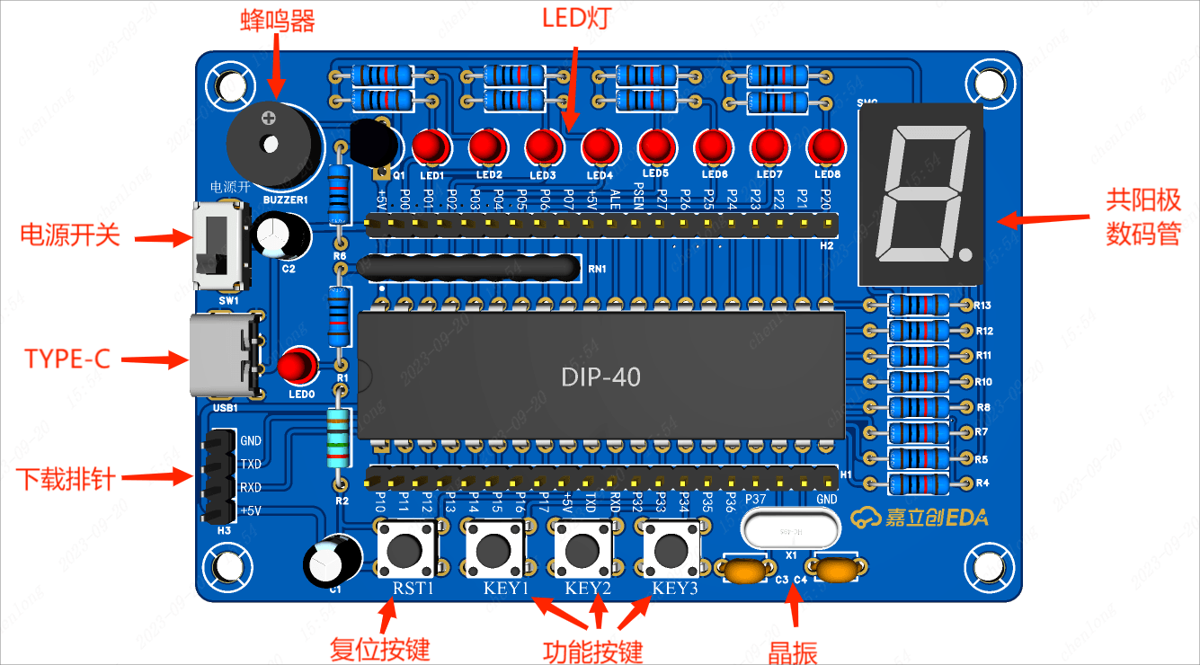 - 外设:8个LED灯、5V有源蜂鸣器、3个功能按键、单个共阳极数码管;