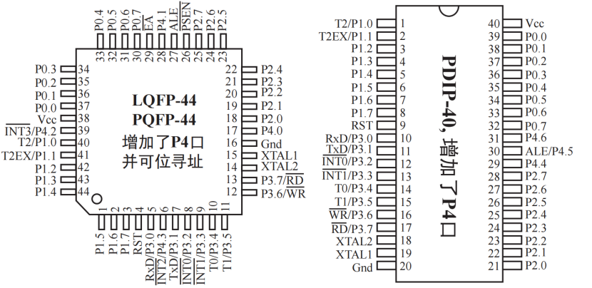 HD版本无P4.4/P4.5/P4.6口,RESET脚内部已有45~100K下拉电阻,EA#管脚内部已上拉到VCC。90C版本无EA、PSEN管脚,有P4.4/P4.5/P4.6口,ALE/P4.5管脚默认是作为ALE管脚使用,作为P4.5口使用时,需要在烧录用户程序时在STC-ISP编程器中设置。