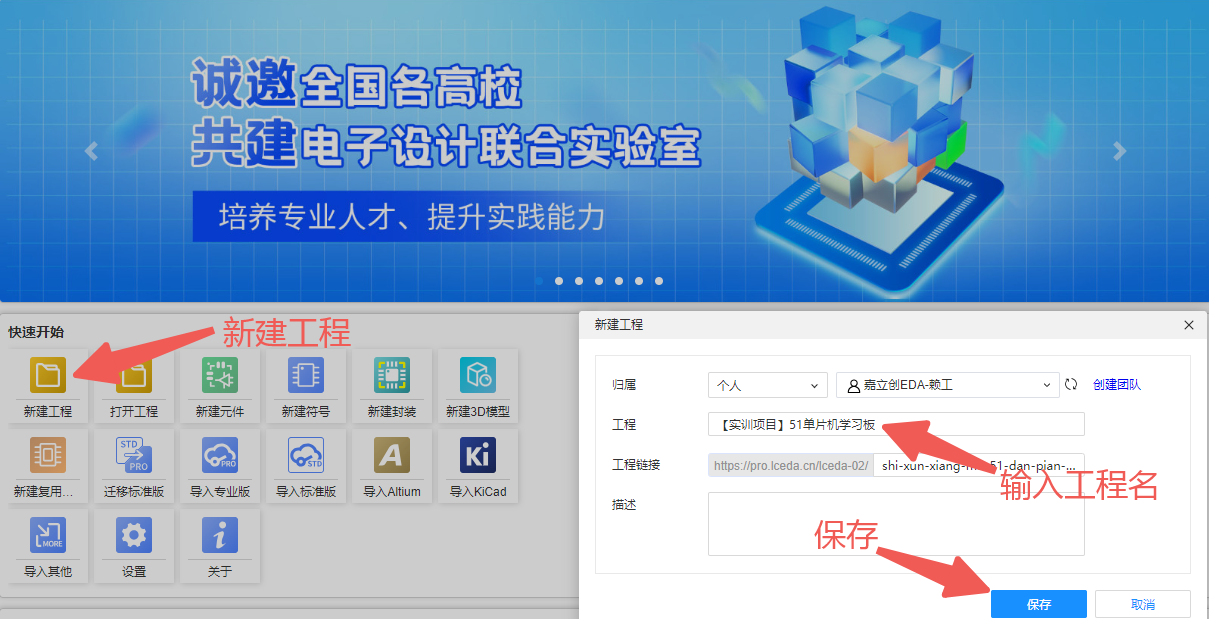打开嘉立创EDA专业版软件(https://pro.lceda.cn/editor), 登录账号后选择创建工程, 输入工程名称:【实训项目】51单片机学习板,系统会自动创建一个工程项目,接下来就在该项目中完成51单片机学习板的原理图与PCB设计。