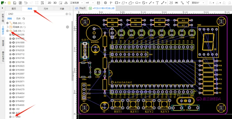 布局时元器件相互连接处有一根淡蓝色的线条,这根线叫做飞线,它起的作用是告诉我们那两个焊盘是相同网络,需要使用导线连接,所以飞线也叫做指引线。但是页面中飞线太多影响布局摆放,在布局走线时可以将GND网络的飞线隐藏,使页面更简洁。隐藏方式是:在左侧"工程设计"列表中选择网络,在搜索栏中搜索GND,在飞线列表中将GND前的眼睛关闭即可。走线完成后别忘了重新打开哦~
