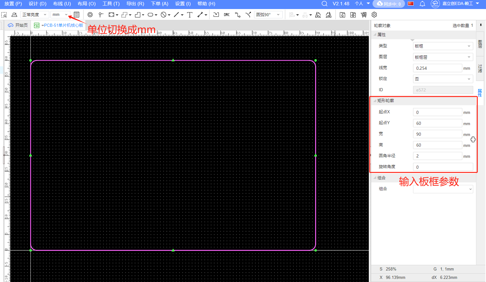 为了使用嘉立创提供的免费打样,这里我们设置51单片机开发板的板框尺寸为90×60mm,在顶部菜单栏处将单位切换成mm,然后点击放置-板框-矩形,在PCB画布中放置绘制一个矩形,点击矩形框,在右侧属性栏中将尺寸修改为90×60mm,圆角尺寸修改为2mm。