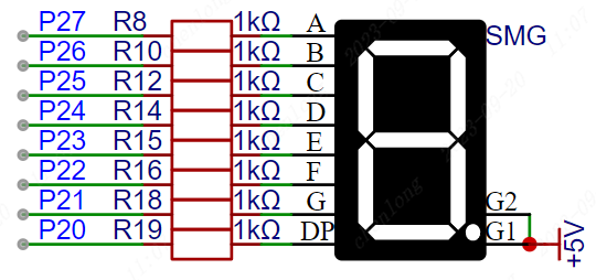 数码管简单理解就算7个长条型的LED灯管+1个圆形LED灯,有了前面LED流水灯电路的基础,数码管电路理解起来就非常方便了,该数码管为共阳极数码管。