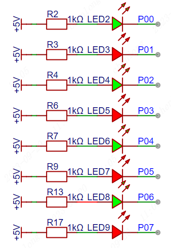 LED流水灯电路,LED灯本质是发光二极管,在二极管的正极处,加入+5V电压,由于二极管阻值较小,如果直接通电,流过电流会很大,容易烧坏二极管,加入1K限流电阻限制电流的大小。在LED灯的右侧,连接STC89C52单片机的IO引脚,当控制IO引脚为高电平时,两侧电平一致,电流无法流过发光二极管,当控制IO引脚为低电平时,电流经过限流电阻流过二极管到IO引脚内部接入GND,此时是一个完整的回路,LED灯被点亮。