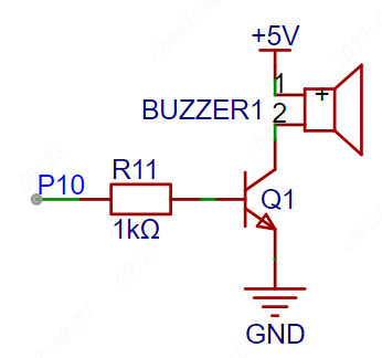 蜂鸣器分为有源蜂鸣器和无源蜂鸣器,有源并不是指电源,而是指震荡源,蜂鸣器是通过震荡来进行发声的。此处用到的是有源蜂鸣器,当给一个电源时,蜂鸣器鸣叫。蜂鸣器鸣叫消耗电流较大,如果使用单片机的IO引脚输出高电平给蜂鸣器供电,可能不足以让蜂鸣器叫,此时加入8050NPN三极管来作为控制,通过控制基极电流来控制三极管的导通与关闭从而控制蜂鸣器是否鸣叫。