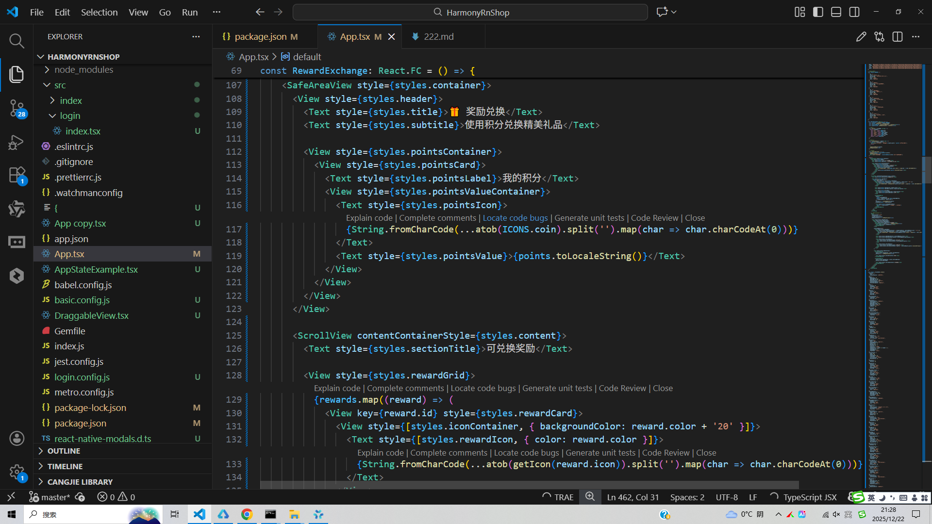 这段React Native代码实现了一个积分奖励兑换系统的用户界面和交互逻辑,采用鸿蒙系统的设计理念和技术架构。