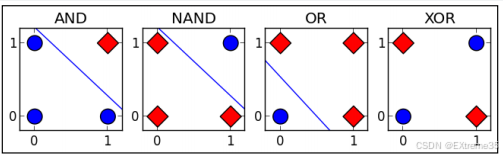 你尝试用一条直线(单层感知机只能做线性分割)将红色点和蓝色点完美分开,能做到吗?答案是不能。无论你如何画,总会有一些点被分错。
